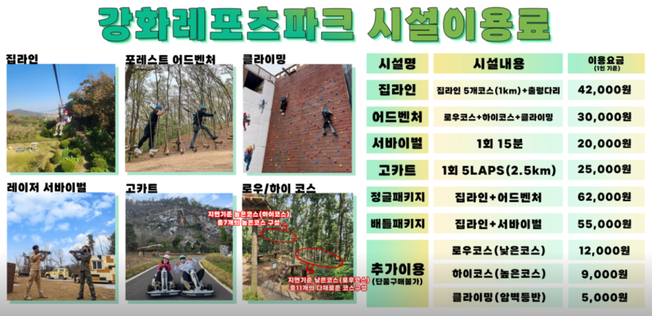 집라인, 어드벤처, 클라이밍, 서바이벌, 고카트를 즐길 수 있어요.