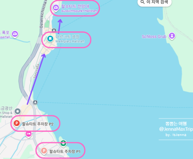 주차장에 내려서 마르크트 광장 → 할슈타트 전망대 코스로 구경하면 됩니다.