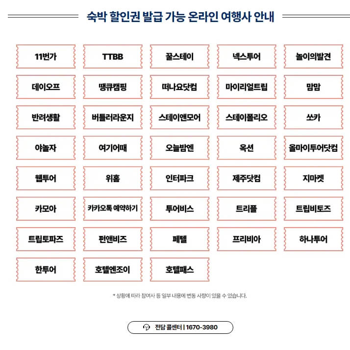 숙박 세일 페스타와 연계된 온라인 여행사 홈페이지에서 받을 수 있어요. 연계된 여행사 목록은 아래와 같으니, 참고해 주세요.