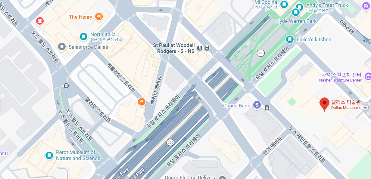 - '달라스 미술관'에서 걸어갈 수 있는 거리예요.