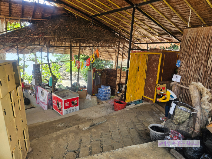 해변가로 내려가는 길에 탈의실이 있습니다.
