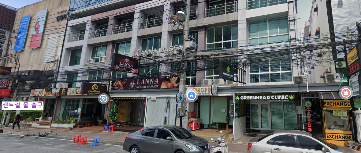 호텔 입구 옆에 있는 센트럴 몰 입구로 들어가서 직진으로 쭉 가다가 반대편 출구로 나오면 마사지 샵이 즐비해 있습니다.