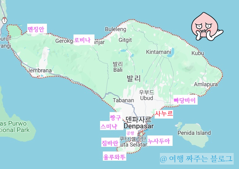 이 중 주요 여행지는 우붓, 짱구, 스미냑, 꾸따, 짐바란, 울루와뚜, 누사두아, 사누르, 우붓, 빠당바이, 로비나, 멘징안 정도가 됩니다.